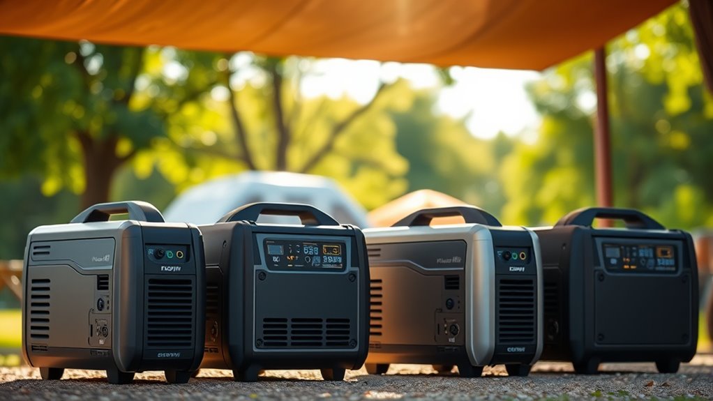 A 3000W inverter generator strikes a great balance between power and portability, making it ideal for a variety of outdoor and emergency uses. It provides enough power to run essential appliances like refrigerators, lights, and laptops continuously. When choosing, consider both surge watts and rated watts: surge watts handle brief startup loads, while rated watts show steady power output. Most 3000W models support small to medium-sized devices, ideal for camping or backup power. Confirm the generator’s capacity matches your current needs and allows room for future expansion. Some models offer parallel connection options, letting you increase capacity if your power demands grow. This flexibility ensures your generator remains useful as your needs evolve, providing reliable, silent operation without sacrificing performance.