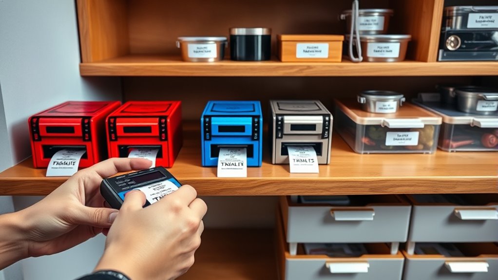 If you’re looking to make organization effortless and stylish, I recommend checking out top label makers like the Nelko Bluetooth model, Brother P-Touch, SUPVAN T50M, and Phomemo D30. These offer portable, wireless design, customizable fonts and symbols, and durable labels suitable for home, office, or travel. Whether you want quick labels or professional-quality outputs, there’s a device for you. Keep going to discover the best options tailored to your needs.