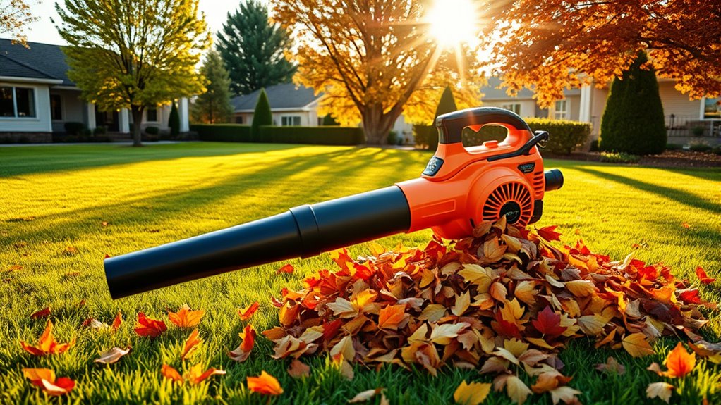 Choosing a leaf blower that’s lightweight and ergonomic can make a significant difference in how comfortable and efficient your yard work feels. I recommend models under 5 pounds, which reduce fatigue and are easier to maneuver during extended use. Ergonomic designs, like padded handles and adjustable straps, help distribute weight evenly, improving comfort and control. Proper weight distribution also lessens strain on your wrists and arms, making the job less tiring. Lightweight blowers are especially helpful for those with physical limitations or for frequent, prolonged tasks. An ergonomic grip with non-slip features ensures secure handling, minimizing slips and enhancing safety. Prioritizing weight and ergonomics allows you to work longer with less discomfort, turning yard cleanup into a more manageable task.