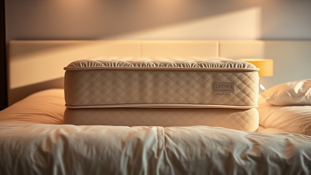 Material quality and safety set the foundation for a luxurious mattress, but support and pressure relief determine how well it helps you sleep comfortably night after night. Hybrid mattresses combine innerspring coils or pocket springs with foam or latex layers, offering targeted support and better spinal alignment. Latex layers naturally conform to your body’s contours, providing consistent support and relieving pressure points. The firmness of support layers influences how pressure is distributed across your body, so finding the right balance is key. Proper support prevents sagging, while effective pressure relief reduces stress on joints, especially hips and shoulders. Contouring materials like memory foam or latex help distribute your body weight evenly, promoting healthier sleep and reducing discomfort.