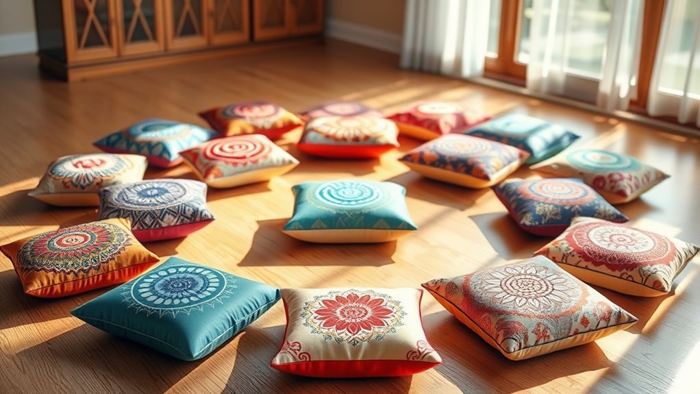 We’ve gathered the 15 best meditation cushions for 2025, focusing on comfort, support, and style. These cushions feature adjustable fillings like buckwheat hulls or memory foam, eco-friendly covers, and ergonomic designs that promote proper posture during sessions. Whether you prefer bohemian patterns, vibrant colors, or traditional styles, there’s a perfect option for everyone. Keep exploring to find out which cushion best supports your practice and fits your decor.