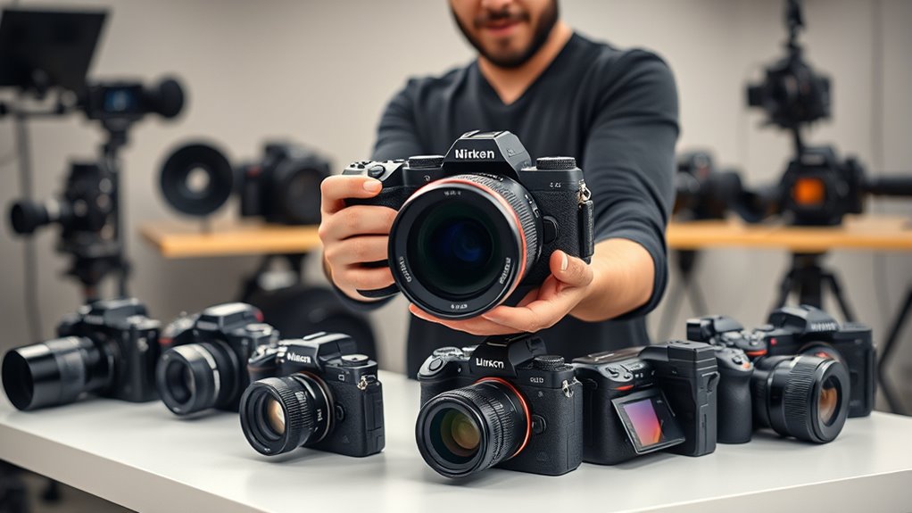 Autofocus precision and tracking are critical factors for professional video, as they guarantee your subject stays sharp and in focus throughout dynamic scenes. Modern autofocus systems with real-time Eye AF and subject tracking make a huge difference, especially when filming moving subjects. Hybrid autofocus, which combines phase detection and contrast detection, ensures quick, reliable focus shifts, reducing focus or lens hunting. A high number of autofocus points spread across the sensor allows for precise focus coverage, even during complex shots. Advanced algorithms leveraging machine learning help maintain focus lock despite rapid movements or obstructions. Consistent autofocus performance in various lighting conditions and backgrounds is essential for delivering professional-quality footage. Choosing a camera with these features ensures your focus stays accurate, sharp, and reliable in every scene.