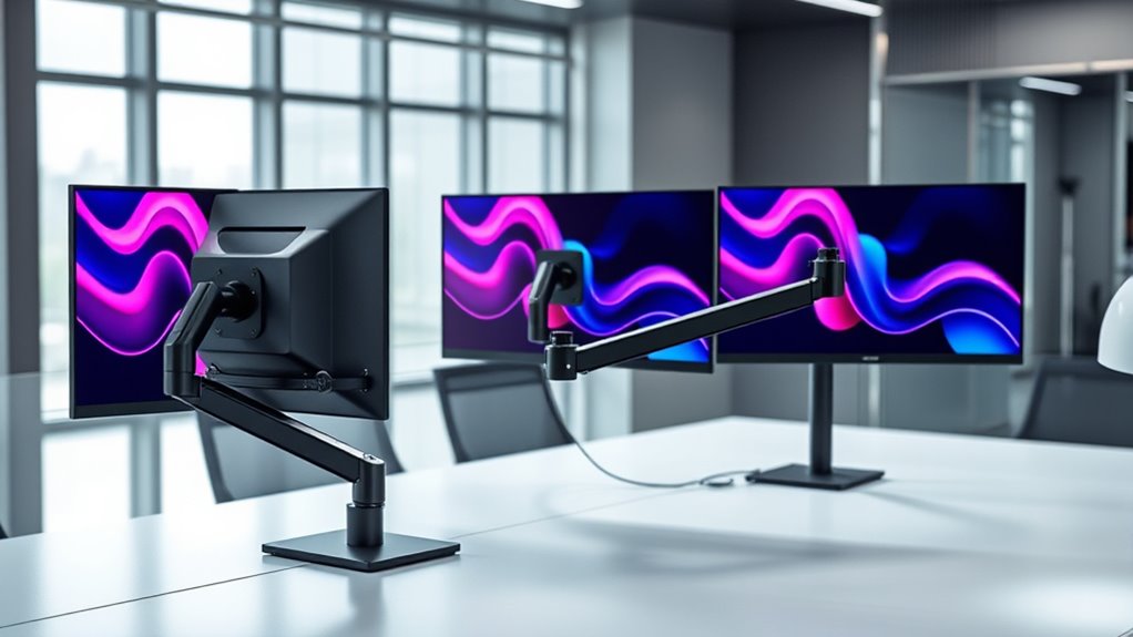 Selecting the right mounting option is essential to guarantee your monitor arm fits well with your desk setup and provides maximum stability. Different desks and preferences call for specific mounting solutions. C-clamp mounts are versatile, attaching securely to desks up to 3.5 inches thick without tools, making them ideal for temporary or flexible setups. Grommet mounts require a hole in the desk surface, offering a sturdy connection perfect for permanent arrangements and thicker desks. Some arms support bolt-through or grommet mounting, which enhances stability for larger or heavier monitors. When choosing, consider your desk material and thickness to assure compatibility. Proper mounting not only guarantees stability but also helps organize your workspace and simplifies installation, making your monitor setup both functional and reliable.