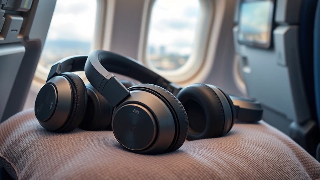 Comfort counts when I wear headphones for hours. I look for plush padding, lightweight design, and adjustable headbands that fit snug but not too tight. Soft, breathable ear cushions prevent discomfort, even during long flights. Features like memory foam padding and ergonomic ear cups help me stay cozy, allowing me to focus on my journey rather than discomfort. These comfort features truly make extended wear enjoyable and effortless.