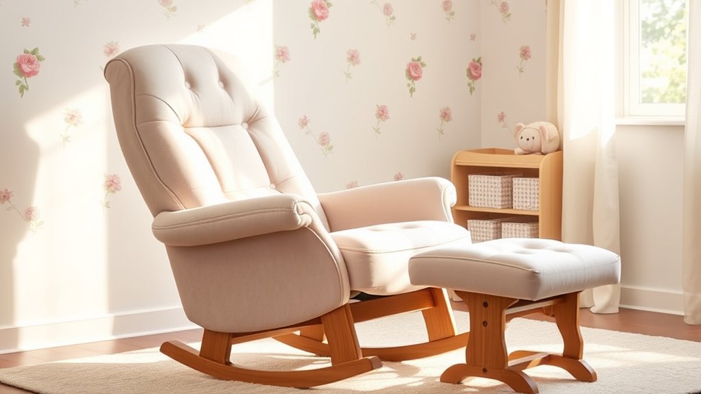Have you ever wondered how to guarantee your nursery glider provides lasting comfort during those long feeding sessions? The key is choosing a chair with plush, supportive cushions and an ergonomic design that suits extended sitting and nursing positions. Look for adjustable features like lumbar support, headrests, and recline angles to customize comfort for your body. A high backrest or padded lumbar area is essential to reduce strain and keep your back supported. Supportive armrests help ease shoulder tension and make breastfeeding or cradling more comfortable. Additionally, select models with durable, high-quality padding and supportive foam that maintain their shape and comfort over time, even with frequent use. Prioritizing these factors ensures your nursery glider remains cozy and supportive through every feed and cuddle.