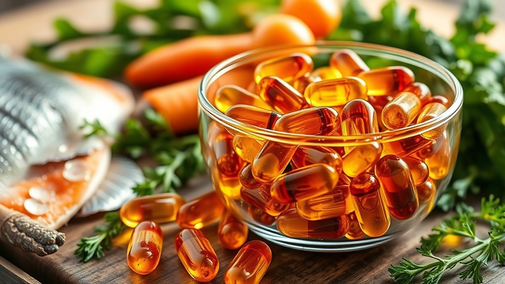 Choosing an omega supplement isn’t just about flavor; how well my body absorbs the nutrients matters even more. Omega-3s in triglyceride form mimic the natural fish oil structure, making them easier for my digestive system to process. These forms are more bioavailable than ethyl ester versions, meaning my body can absorb and utilize them better, often resulting in higher serum levels after ingestion. Softgels containing triglyceride omega-3s also require less processing and heat during manufacturing, which helps preserve their nutrient quality. Plus, triglyceride forms tend to cause fewer fishy aftertastes or burps, making them more tolerable. Because of their higher absorption rates, I can often take lower doses to achieve the same health benefits, making triglyceride omega-3s both effective and convenient.