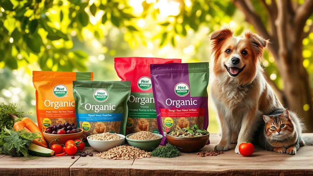 We’ve found the 15 best organic pet foods that help keep our furry friends happy and healthy. These options feature high-quality, humanely raised ingredients like organic chicken, real produce, and superfoods that support coat condition, digestion, and importance. Many are USDA certified, non-GMO, and free from artificial additives, ensuring our pets get natural, safe nutrition. To discover the top choices and what to think about, keep exploring for more tips and insights.