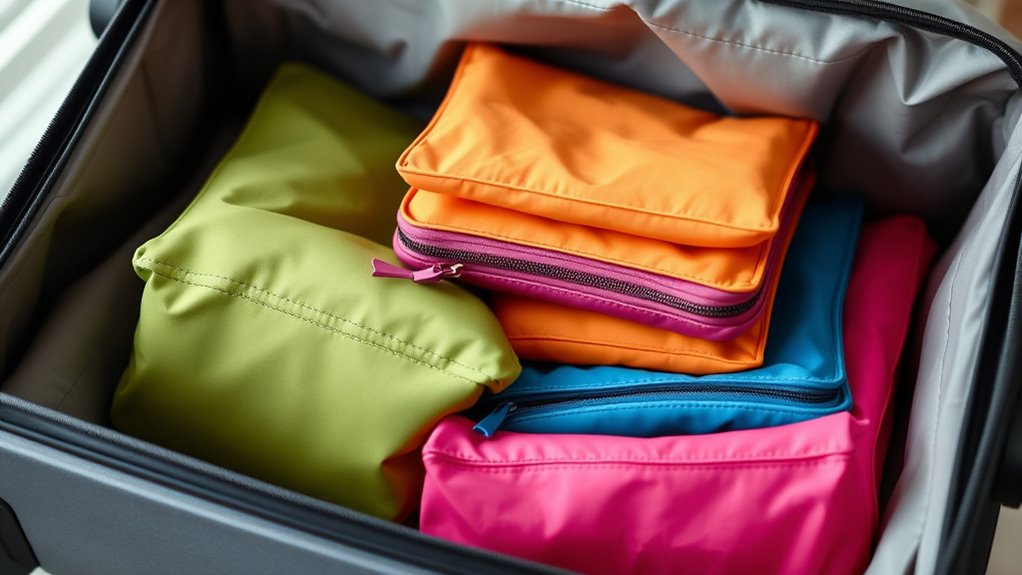 Ever wondered how the right size of packing cubes can make packing more efficient? Choosing the correct sizes helps your luggage stay organized and prevents overpacking. Larger cubes are perfect for bulky items like sweaters and jeans, while smaller ones work well for underwear, socks, or toiletries. Pay attention to the volume and weight capacity of each cube to avoid overstuffing, which can damage your clothes or make packing harder. Using a mix of sizes allows you to maximize space and keep everything easy to access. Also, verify the dimensions match your luggage type, whether it’s a carry-on, checked bag, or backpack. Proper sizing simplifies packing, keeps your belongings neat, and helps you make the most of limited space.