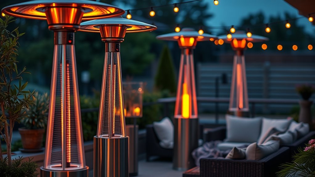 Choosing a commercial-grade patio heater that’s both effective and eco-friendly means paying close attention to its technology and fuel source. Infrared or radiant heating technology is ideal because it directly warms people and objects, reducing wasted energy. Many high-efficiency models feature double-layer heating elements or advanced reflectors, maximizing heat transfer while lowering energy consumption. Using clean-burning fuels like propane considerably cuts emissions compared to outdated methods. Proper placement and safety features not only ensure effective heat distribution but also reduce unnecessary energy use, minimizing environmental impact. Energy-efficient models often include adjustable heat controls and safety shutoffs, helping conserve fuel and prevent overuse. Overall, selecting a heater with these features promotes sustainable outdoor heating without compromising performance.