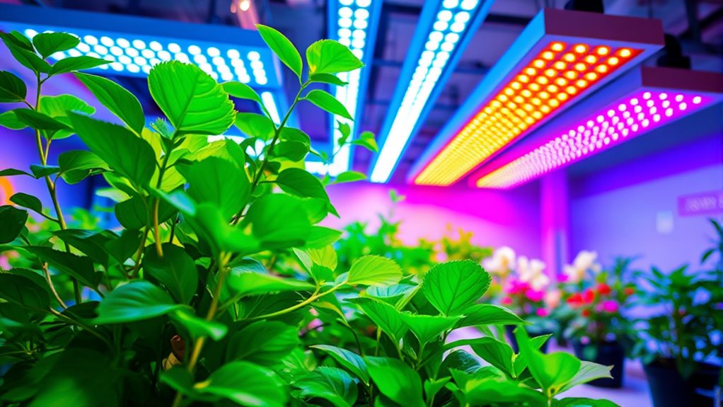 Choosing the right light spectrum is vital because it directly affects how plants grow indoors. Full-spectrum grow lights emit light from 380nm to 800nm, covering ultraviolet, visible, and infrared wavelengths, supporting all growth stages. Red (660nm) and blue (460nm) LEDs are essential for photosynthesis; red promotes flowering and fruiting, while blue encourages vegetative growth. Adjustable spectral modes let us customize the light for specific needs, such as seedling development or blooming. Some grow lights also include multi-color options like white, warm white, or natural light, enhancing plant health and visual growth. Remember, the combination of spectrum and PPFD determines how effectively plants convert light into energy, influencing growth rate and yield. Getting the right spectrum guarantees ideal indoor plant development.