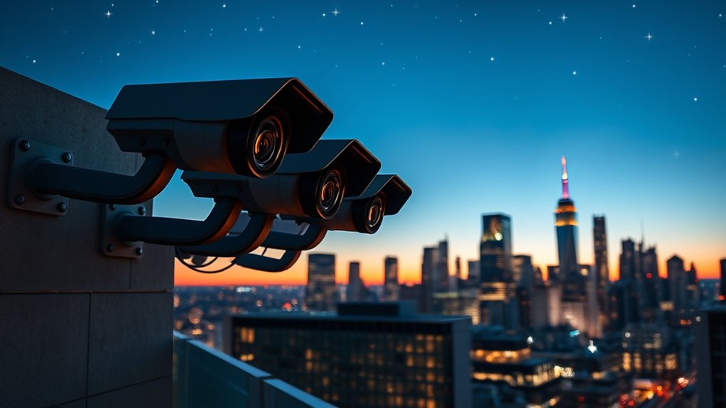 I guarantee my security cameras stay protected by using strong, unique passwords and enabling multi-factor authentication. I keep firmware updated regularly to patch vulnerabilities and use encrypted connections like VPNs to prevent unauthorized access. Additionally, I disable remote access when not needed and monitor network activity for suspicious behavior. These steps make it much harder for hackers to compromise my PoE security system, keeping my footage safe and private.