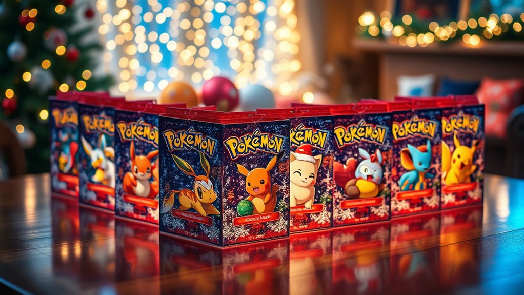The collectible appeal of the Pokémon TCG Holiday Calendar 2025 is markedly boosted by its seasonal exclusives, which set it apart from standard releases. These exclusives often include limited-edition foil cards with festive stamps or unique artwork that you can’t find elsewhere. Such cards add significant value for collectors, making the calendar a must-have during the holidays. Additionally, some calendars feature exclusive booster packs or special accessories, providing a unique experience that standard products can’t match. These seasonal-themed cards and items are usually available only within the holiday calendar, emphasizing their limited-time nature. The rarity and distinctive design of these exclusives can greatly enhance the calendar’s overall appeal and perceived worth, making it an exciting addition to any Pokémon TCG collection.