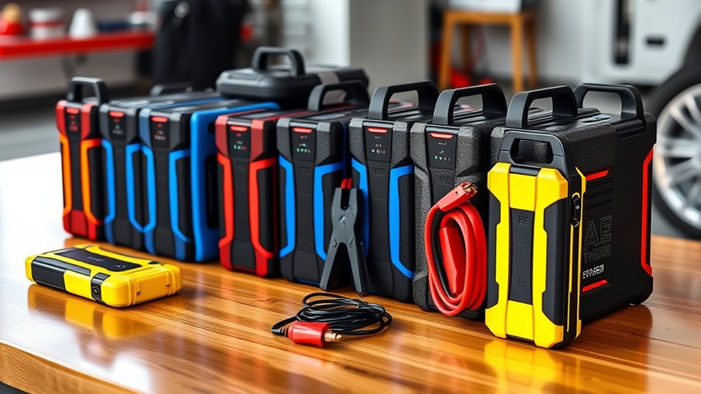 Have you ever struggled to fit a bulky jump starter into your car or bag? If so, you’re not alone. Many portable jump starters weigh between 1.7 to 3.2 pounds, making them easy to carry without fatigue. Compact sizes, like 6.61 x 3.37 x 1.7 inches, mean you can store them in glove compartments, backpacks, or emergency kits seamlessly. Slim designs let you quickly retrieve and use them in tight engine bays or cramped spaces. Lightweight models with high-capacity batteries are a game-changer—they’re easy to handle yet powerful enough for multiple starts. Plus, devices with foldable or integrated handles boost portability, ensuring you’re prepared no matter where you are. Size and weight matter when it comes to emergency readiness.