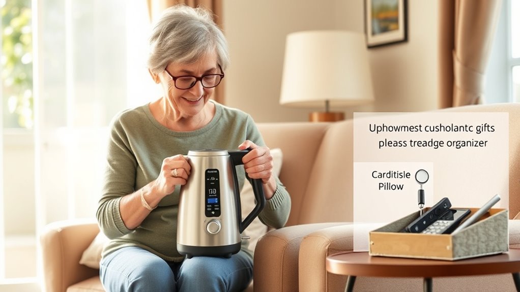 Ensuring that practical gifts are easy to use is essential for helping elderly parents maintain their independence. I look for items with large, easy-to-read controls or labels, which help those with visual impairments navigate devices confidently. Simple, straightforward operation reduces frustration and encourages regular use. Ergonomic designs with non-slip handles or grips make daily tasks safer and more comfortable, minimizing strain. I also prioritize gifts that require minimal setup or maintenance, so parents aren’t overwhelmed or discouraged. Lightweight, easy-to-handle items are especially beneficial, as they lessen physical effort and fatigue. By focusing on these factors, I can choose practical gifts that truly support my parents’ independence and make their daily routines smoother and more enjoyable.