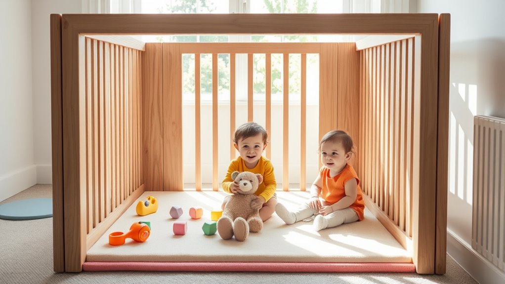 Beyond visibility, considering additional features and accessories can markedly boost a playpen’s versatility and your child’s enjoyment. Built-in toys, activity panels, or pull-up rings encourage developmental growth and keep your little one engaged. Comfort and safety are also essential—soft mats, foam tiles, and waterproof liners create a cozy, secure environment. Convenience matters too; look for playpens with travel bags, foldable designs, or quick-assembly features to make setup and transport effortless. Extra safety accessories like mesh covers, anti-slip suction cups, and secure zippers add peace of mind, ensuring your child’s safety. Additionally, compatibility with accessories such as ball pits, toys, or canopy attachments can extend entertainment options and functionality. These features make your playpen more adaptable, safe, and fun.