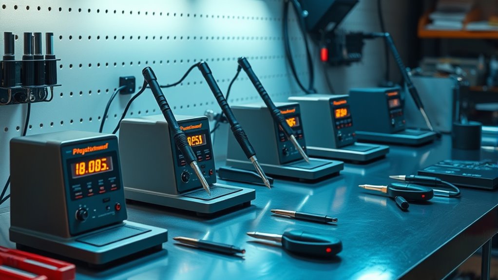 When selecting a premium soldering station, safety and build quality are crucial considerations that guarantee reliable and secure operation. A high-quality station features durable, heat-resistant, and insulated components to prevent accidents. Safety features like automatic shut-off, sleep modes, and overcurrent protection help avoid mishaps and extend device lifespan. Precise temperature control with PID stabilization minimizes thermal fluctuations, protecting sensitive components. Ergonomic grips and stable, anti-slip bases enhance operator safety by reducing slips and accidental contact with hot parts. Additionally, certification standards such as UL, ETL, or CE confirm the station meets safety regulations and quality benchmarks. Prioritizing these factors ensures you get a soldering station that’s not only efficient but also safe and built to last.