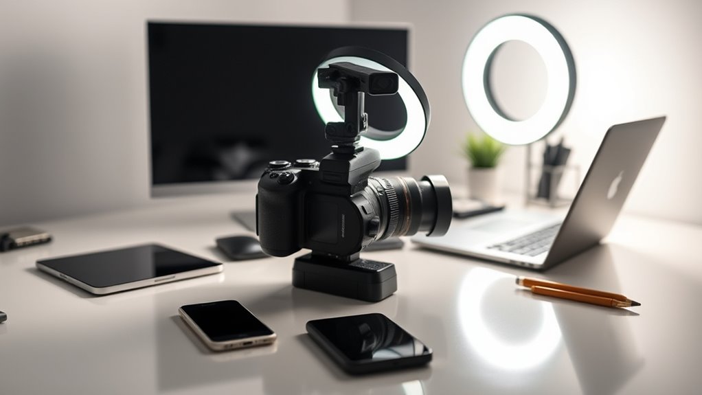 Ring lights can enhance skin tone and color accuracy by providing even, diffused illumination that reduces shadows and highlights natural hues. When chosen correctly, they help our skin look vibrant and true-to-life on camera. However, some lights with poor color temperature may distort colors or give a yellowish or bluish cast. So, selecting a ring light with adjustable color temperature guarantees we get the most accurate and flattering results.
