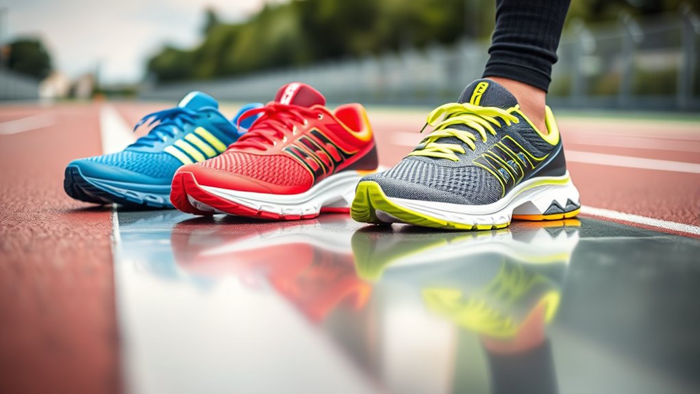 Selecting the right running shoes hinges on finding the perfect balance of cushioning and support to match your running style and foot type. Proper cushioning helps absorb impact forces, reducing stress on your joints and muscles, especially during long runs. Support features like arch stabilization and responsive midsoles keep your foot aligned and prevent overpronation or supination. The level of cushioning should suit your needs—softer midsoles provide more shock absorption, while firmer ones offer better stability. Adequate support minimizes fatigue and discomfort, helping your foot maintain its natural motion. Ultimately, the right combination of cushioning and support enhances overall comfort, reduces injury risk, and improves running efficiency, making it essential to contemplate these factors carefully when choosing your ideal pair.