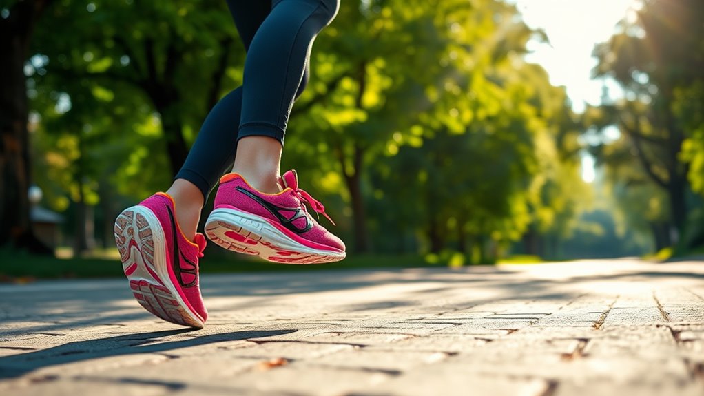 Cushioning and comfort are essential factors to contemplate because they directly affect how your feet feel and perform during a run. Adequate cushioning absorbs impact forces, reducing stress on your joints and helping you avoid fatigue during long runs. The midsole material plays a big role—softer foams offer plush support, while firmer materials provide stability. Proper cushioning can improve efficiency by enabling a more natural foot strike and reducing pressure points. Your foot type matters here: high arches benefit from more shock absorption, whereas flat feet may need firmer support to prevent overpronation. Keep in mind, too much softness can compromise stability, so finding a balance tailored to your activity level and foot mechanics is key to comfort and performance.