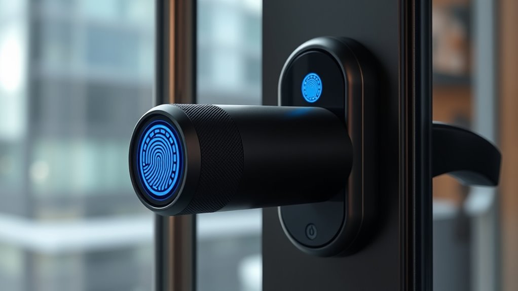 Smart locks with fingerprint readers offer a variety of opening methods that can greatly enhance convenience and security. Having multiple options like app control, keypad codes, RFID cards, and mechanical keys means I can choose the most suitable method for different situations. For emergencies or shared access, alternative methods guarantee seamless entry even if fingerprints aren’t recognized temporarily. Combining biometric, digital, and traditional key options caters to diverse user preferences and security needs. Some locks integrate fingerprint recognition with features like auto-lock, temporary codes, or remote access, so I need to contemplate how these methods fit into my daily routine. The variety of unlocking options impacts the lock’s complexity, security, and setup process, making it essential to select a system aligned with my specific access requirements.