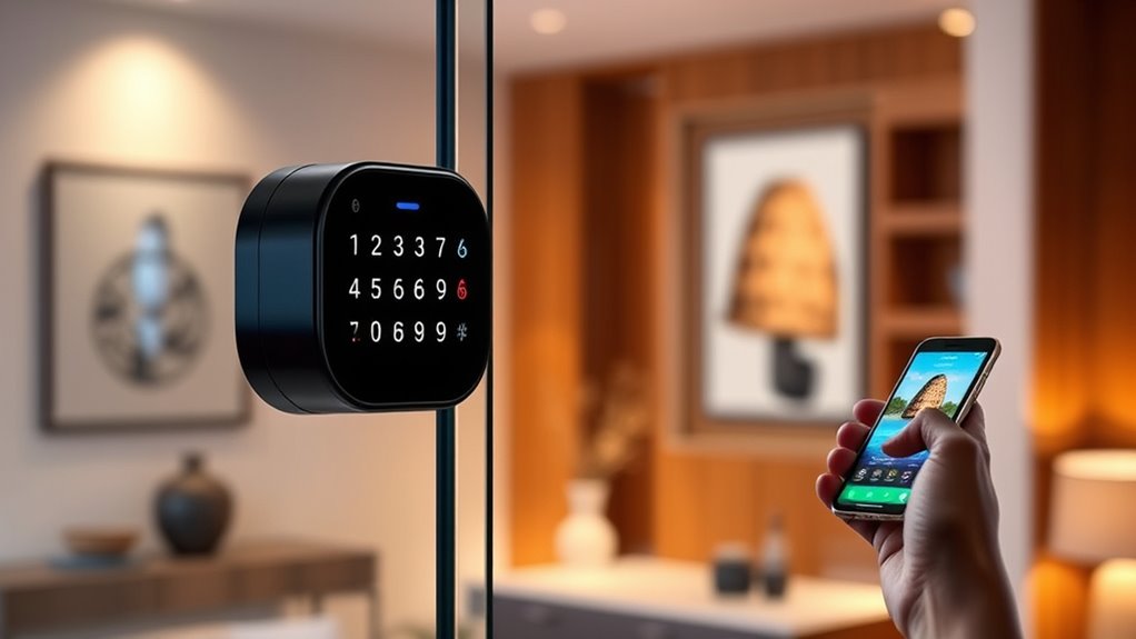 Selecting a smart lock involves considering the variety of opening methods it offers to suit your lifestyle and security needs. Many models feature keypad PINs, fingerprint recognition, smartphone app control, physical keys, and voice commands, giving you flexible options. Biometric access with quick recognition—often under half a second—boosts both convenience and security. Backup methods like physical keys are essential, guaranteeing access during power outages or electronic failures. Additionally, some locks allow you to set temporary or scheduled access codes, perfect for guests, service providers, or family members. This variety means you can choose an unlocking method that fits your daily routine while maintaining the security level you desire. Carefully evaluating these options helps confirm you select a smart lock that offers both ease of use and peace of mind.