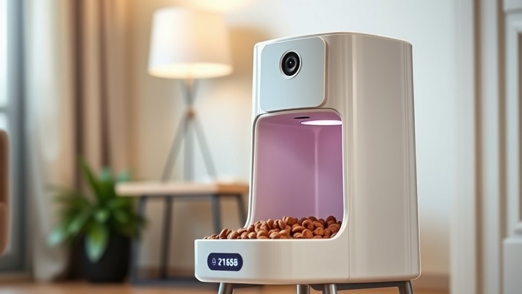 Power backup features are essential for smart pet feeders with cameras because power outages can disrupt scheduled feedings and monitoring. A reliable backup system, like batteries or UPS, guarantees your pet still gets fed even when the power goes out. Backup batteries, whether D-cell or lithium-ion, can last anywhere from hours to days, depending on the device’s energy needs. Devices with integrated backup systems are especially valuable—they automatically switch to backup power, keeping your pet’s schedule intact and maintaining security footage. This minimizes the risk of missed feedings, data loss, or security gaps. Proper power backup features provide peace of mind, ensuring your pet stays fed, monitored, and safe, no matter what happens to the main power supply.