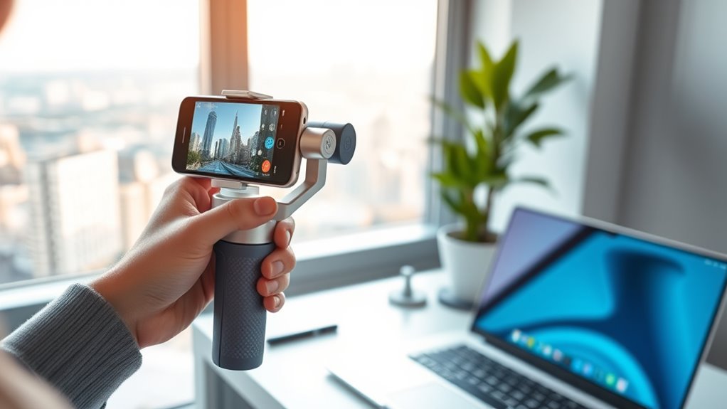 Gimbals improve video stability across various environments by actively balancing your smartphone, reducing shakes and jitters. Whether you’re walking, running, or filming in windy conditions, they smooth out motion, ensuring professional-looking footage. With motorized stabilization and adjustable settings, gimbals adapt to different shooting scenarios effortlessly. This means you can capture steady, high-quality videos no matter where you are, making your content look polished and cinematic.