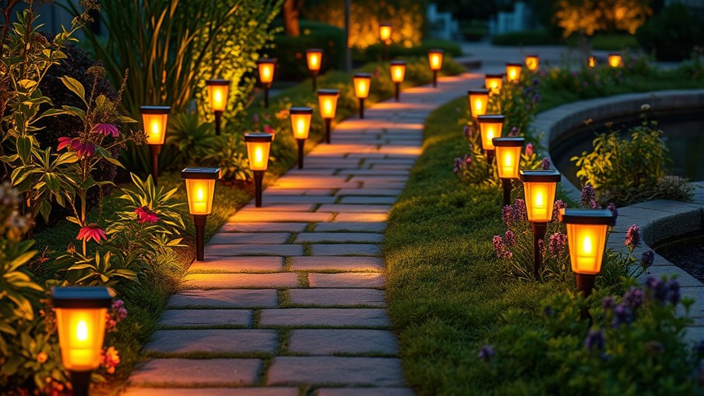 If you’re looking for the 15 best solar pathway lights for your garden in 2025, I’ve found stylish options that combine durability, beautiful design, and reliable performance. These lights vary from modern rectangles to vintage or decorative patterns, with some offering dual-color modes. They’re easy to install, weather-resistant, and provide 8-12 hours of gentle illumination. Keep exploring to discover which lights fit your garden’s style and needs perfectly.