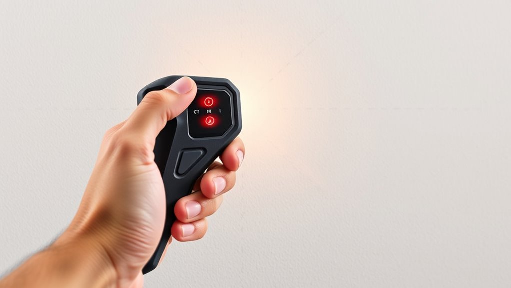 Safety features are a vital consideration when choosing a stud finder, as they help prevent accidents and guarantee reliable results. Many models include live wire detection, alerting you to electrical hazards behind walls before drilling or hanging. Visual indicators on LCD screens and audio alarms provide clear warnings of potential dangers, ensuring you stay aware of what’s hidden behind surfaces. Some devices feature automatic calibration and sensitivity adjustments, reducing false alarms and improving detection accuracy. Ergonomic, non-slip grips enhance stability during use, minimizing slips or mishaps. Additionally, advanced safety features like automatic shutoff and low battery indicators help keep the device functioning reliably during critical tasks. Prioritizing these features can make your project safer and more efficient.