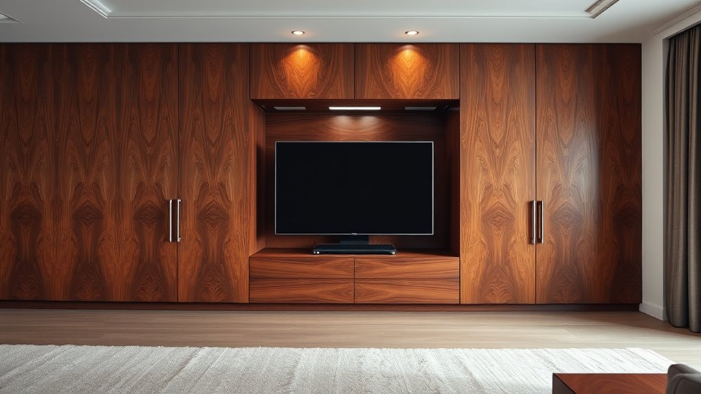 A quiet and smooth TV lift enhances your viewing experience by preventing distractions and guaranteeing seamless operation. High-quality lifts operate below 50 decibels, so you won’t be disturbed during quiet moments or late-night viewing. A powerful, calibrated motor guarantees steady, vibration-free movements, making transitions effortless. During manufacturing, these lifts are tested for consistent performance over time, which is vital for longevity. Features like soft start and stop technology help prevent abrupt movements, reducing wear and tear while maintaining silence. Proper installation and regular maintenance, such as lubrication and secure mounting, are essential for ongoing quiet, smooth operation. Choosing a lift with these qualities ensures your cabinet remains both functional and unobtrusive, elevating your overall home entertainment setup.