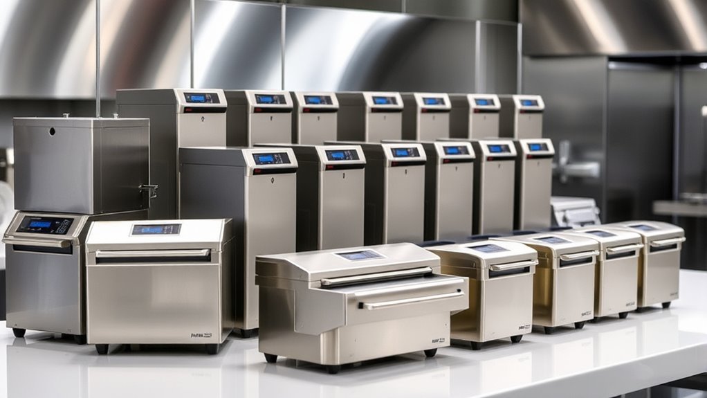 Choosing the right sealing chamber type is essential because it directly affects the vacuum sealing’s effectiveness and suitability for different food items. Chamber vacuum sealers operate by placing the entire bag inside a sealed chamber, allowing for stronger and more uniform seals, especially useful for liquids and moist foods. They support larger bag sizes and higher vacuum pressures, making them ideal for commercial settings that require durable, long-term storage. Non-chamber sealers, on the other hand, use a single seal bar and are more compact, but they’re less effective for liquids and soft items. They’re best suited for dry foods. Additionally, chamber models often feature removable chambers, simplifying cleaning and maintenance, which is vital for preventing cross-contamination in professional environments.