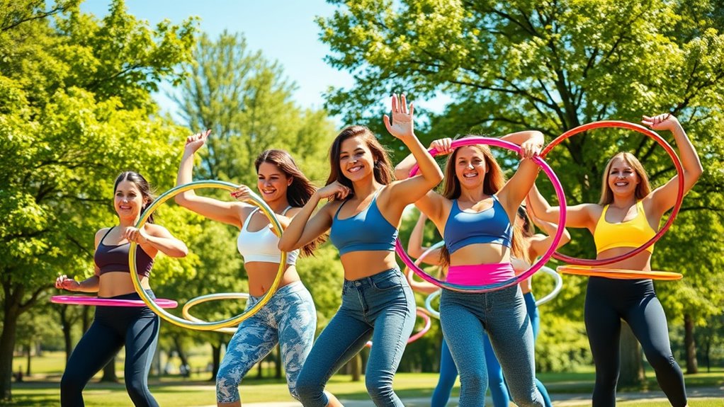 Like a knight preparing for battle, we recommend beginners start slowly with weighted hula hoops. Always wear comfortable clothing, make sure your space is clear, and begin with short sessions to avoid soreness. Listen to your body and stop if you feel discomfort. Staying hydrated and gradually increasing your workout duration helps prevent injury. Following these precautions, you’ll enjoy safe, effective fun while boosting your core strength.
