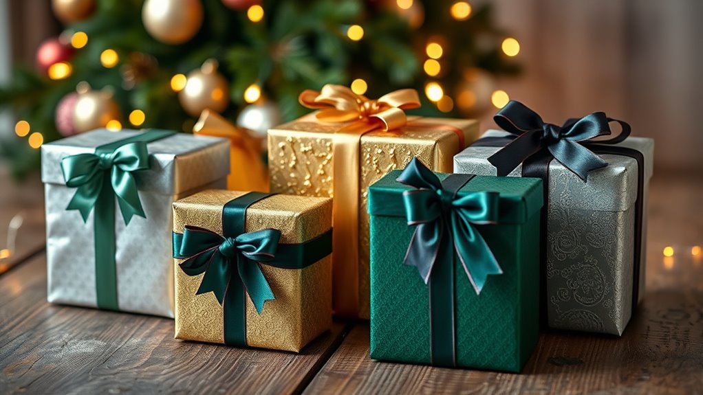 Have you ever considered how well a gift fits the season? Choosing seasonal relevance guarantees your gift feels timely and meaningful. When selecting presents related to upcoming holidays or seasonal activities, they’re more likely to be used and appreciated. Incorporating seasonal themes or colors can make your gift feel festive and aligned with current celebrations. Think about the climate too—warm accessories are perfect for winter, making them both practical and thoughtful. Staying aware of seasonal trends and popular items shows you’ve put effort into matching your gift to the time of year. This approach not only enhances the recipient’s experience but also makes your gift feel more personal and timely, creating a memorable holiday moment for everyone involved.