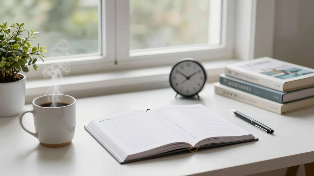 Your daily reset routine should take about 10 to 15 minutes. This brief period helps you refocus and set clear priorities, improving your time management and productivity strategies. Keep it simple—review your tasks, clear your workspace, and plan for the next day. By dedicating just a few minutes, you create a smoother shift between work and personal life, reducing chaos and boosting your overall efficiency.